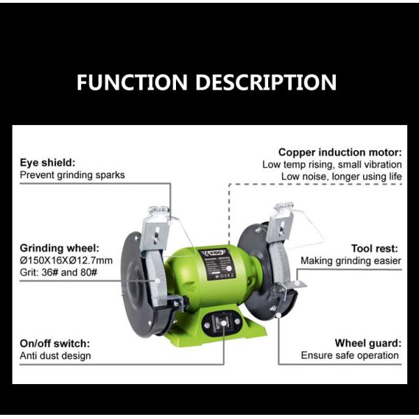 The machine is for sharpening tools such as drill bits and chisels, or grinding small metal parts. It is not suitable for grinding heavy sheet metal parts. It is not suitable for grinding soft substance such as wood, plastic, lead, magnesium and light alloys.